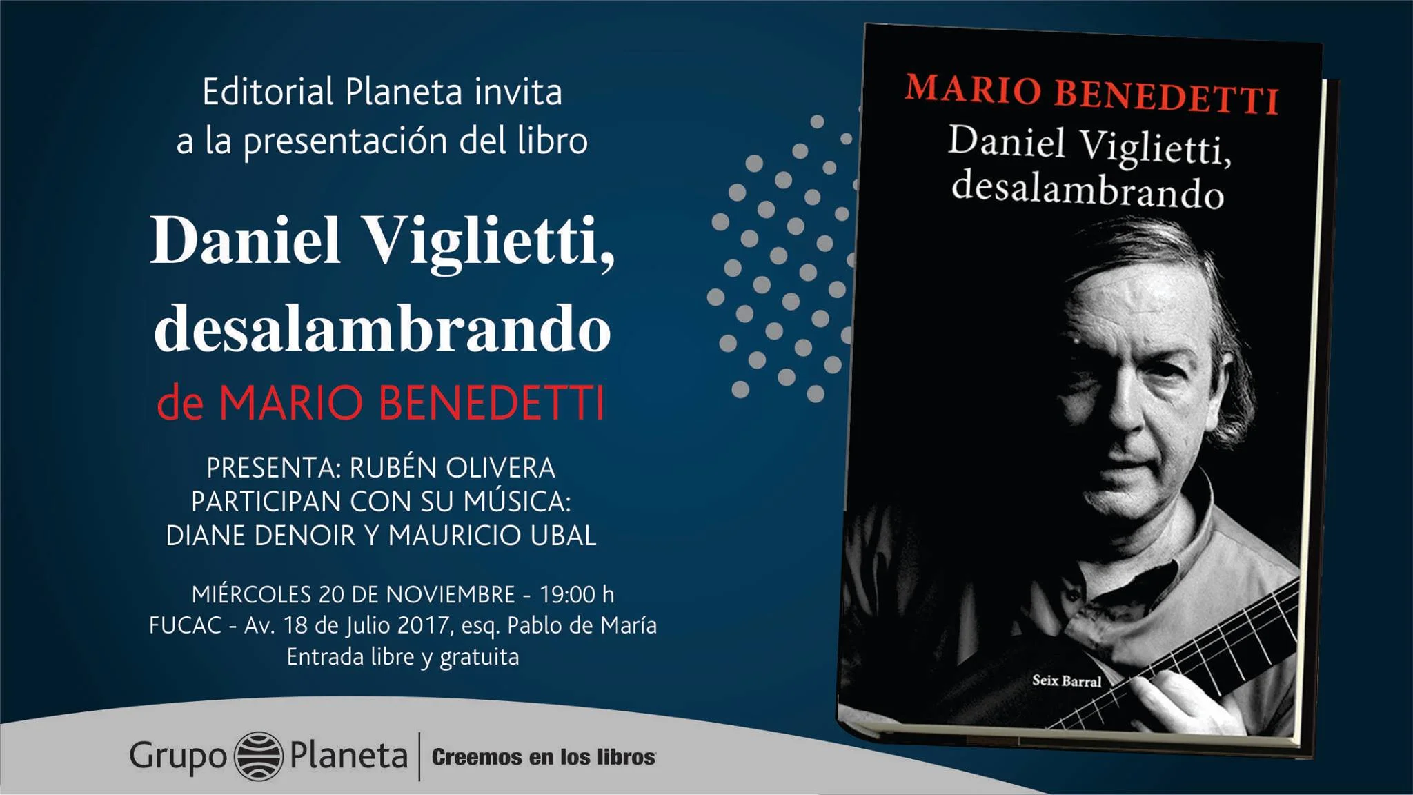 Editorial Planeta invita a la presentación del libro «Daniel Viglietti, desalambrando» de Mario Benedetti, este próximo miércoles 20 de noviembre a las 19:00 horas en el Centro Cultural FUCAC (Av. 18 de Julio 2017, esq. Pablo de María).
