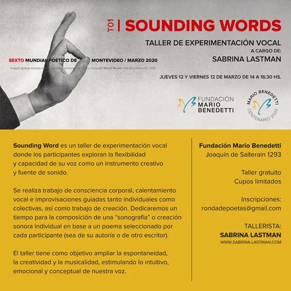 Siguen las actividades en la Fundación. En el marco del Mundial Poético de Montevideo, este jueves 12 y viernes 13 de 14 a 16:30 hs se llevará acabo el TALLER DE EXPERIMENTACIÓN VOCAL cargo de Sabrina Lastman. «Sounding Word» es un taller donde los participantes exploran la flexibilidad y capacidad de su voz como un instrumento creativo y fuente de sonido». Inscripción libre y gratuita por: rondadepoetas@gmail.com