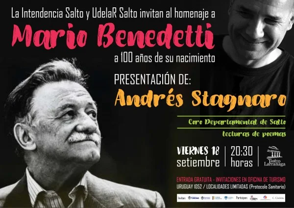 DescripciónHomenaje a Mario Benedetti con la presencia de Andrés Stagnaro.Lectura de poemas a cargo de Evangelina CavalhoActuación del Coro Departamental de SaltoViernes 18/0920:30hsTeatro LarrañagaHomenaje a Mario Benedetti con la presencia de Andrés Stagnaro.