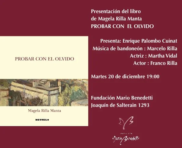 El martes 20 de diciembre a las 19:00 horas, les esperamos en la sede de la Fundación Mario Benedetti para la presentación del libro «Probar con el olvido» de Magela Rilla Manta.