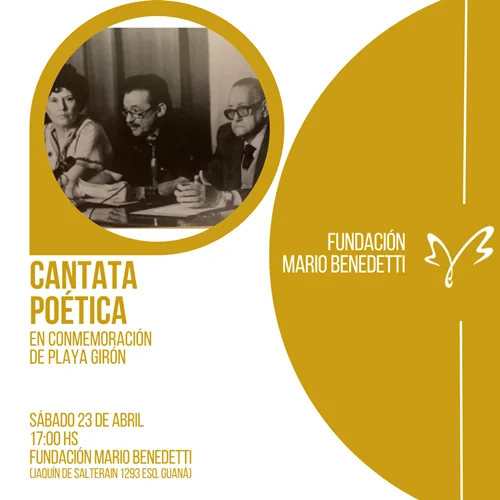 La Fundación Mario Benedetti, conjuntamente con la Embajada de Cuba en el Uruguay, tiene el agrado de invitarles a la Cantata Poética que tendrá lugar el próximo sábado 23 de abril a las 17:00 hs.