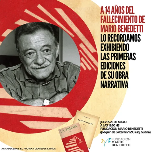 Mario Benedetti nos dejó hace catorce años y en su testamento creó esta Fundación para custodiar su legado literario y promover los Derechos Humanos. En el cincuenta aniversario del golpe de estado del cual fue víctima y eminente opositor, lo recordaremos exhibiendo las primeras ediciones de su obra narrativa que constituyen un patrimonio material y simbólico que queremos compartir con todos los que quieran acercarse a nuestra sede. El 25 de mayo a las 19 horas se inaugurará la muestra previo a la segunda fecha del ciclo «Gente en verso» que promueve la poesía contemporánea.