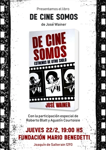 El jueves 22 de febrero a las 19:00 horas, se llevará a cabo la presentación del volumen titulado De cine somos. Estrenos de otro siglo en la Fundación Mario Benedetti, Joaquín de Salterain 1293.