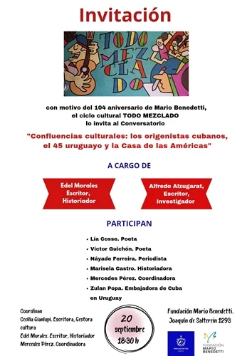 Están todos invitados a esta 5ta actividad de Todo mezclado. «Confluencias culturales», es un interesante conversatorio sobre el Grupo Orígenes en Cuba, la generación del 45 en Uruguay y La Casa de las Américas. La vinculación con Mario Benedetti son temas que se abordarán, para juntos celebrar el 104 aniversario del escritor.