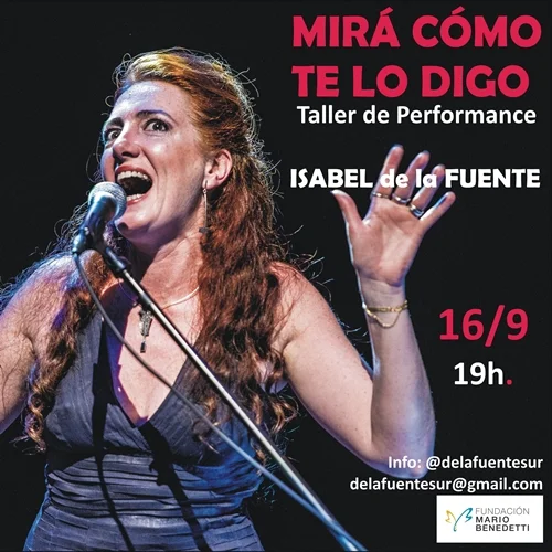 Isabel de la Fuente, poeta, actriz, y gestora cultural. Egresó de la Escuela de Acción Teatral Alambique y estudió Licenciatura en Letras en la FHCE. Trabaja en teatro, espectáculos multidisciplinarios y performances. Es docente de taller literario, de teatro y creadora del Seminario Cuerpo de Letra (Escritura en Movimiento y Performance) y del Taller de Performance Mirá cómo te lo digo. Obras suyas se incluyen en diversas publicaciones y antologías, y ha publicado El silencio que nadie (Ed. de la autora, 2002), Mal puñal (Artefato, 2003), Antología de Poesía Portuguesa Contemporánea, compilación y traducción suyas (Estuario, 2009), entre otros. Ha realizado diversas muestras de poesía visual y de poesía y plástica. Desde 1996 coordina el Ciclo Literario CaRAMELOS y PiMIENTOS. Ha participado en Festivales de Argentina, Brasil, Uruguay, Estados Unidos, Italia y Austria. Premio Morosoli en Literatura, 2005. 2° Prix Molière, 2003. Primer Premio en el 9° y en el 10° Encuentro de Teatro Joven, 1999 y 2000.